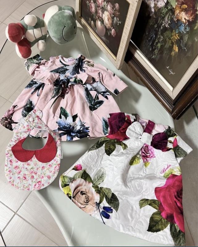 Набор из платьяшек и слюнявчика, почти в идеальном состоянии все(на одном есть незаметная зацепка). Без рукавков: 0-3 мес, длин 31, спинка19, пог 25/26, сзади на пуговицах; с рукавчиками: длиннее 33, плечи 16, пог 24, рукав 19 тянется. Ответим на все вопросы, дополнительные фото по запросу. Ціна за набір