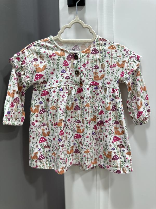 Очень милое платье на маленькую девочку от бренда f&f, коттоновое, милый принт в зверушки и цветы, декоративные пуговицы посередине, состояние новой, размер на 74см