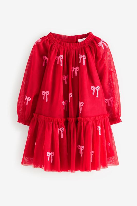 Красивое платье для девочки от Next. Платье с длинными рукавами с розовыми бантиками на ярко-красном фоне, выполнено из многослойной сетчатой ткани, с юбкой-кружевом, завершенной сборкой по горловине. Основной материал: 100% полиэстер. Подкладка 100% полиэстер. Размер 86-92 Заколка бантик в подарунок 🎁