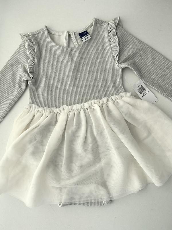 Нова сукня-боді з мʼякою фатиновою спідничкою, боді ззовні йде з люрексною блискучою ниткою, а всередині гладеньке і приємне до тіла. Розмір по бірці : 12-18М Заміри : Довжина від плеча до нижньої застібки - 41 см Довжина рукава - 29 см Ширина по плечовому шву - 19 см
