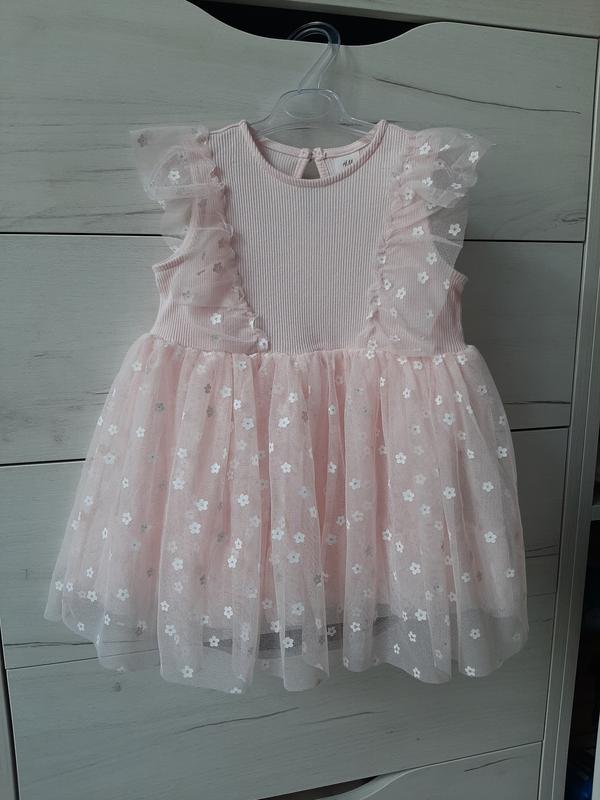 Идеальное платье для девочки нежно-розового цвета. Верх - бавовняний, тканина "в рубчик". Низ - три слоя юбки, к телу - хлопковый, два верхних - из фатина. Фатин – воздушный белый в белую ромашку с маленькой золотой серединкой. Выглядит при этом стильно, просто и очень изысканно. Одета один раз в фотосессию, состояние новой. Фирма - H&M (коллекция 2024 года). Размер - 80 см (9-12 m), подойдет до 18 месяцев, в зависимости от роста ребеночка.