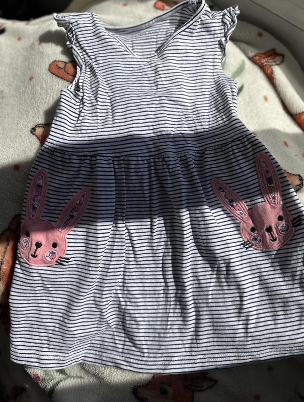 По бірці -12-18 місяців Трішки тягнеться Колір:білий Матеріал:100% котон Груди-25 см Талія-29 Стегна -39 см Довжина -44 см Дефект на 3-му фото Малесенька малопомітна дірочка