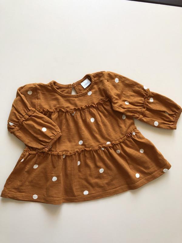 Миле платтячко-туніка від Next, легка натуральна тканина, добре підійде на весну/літо, трендовий колір і цікавий крій, принт у крупний горошок. Колір - гірчично-коричневий. Розмір на 6-9міс, на зріст 68-74см. Заміри на фото.