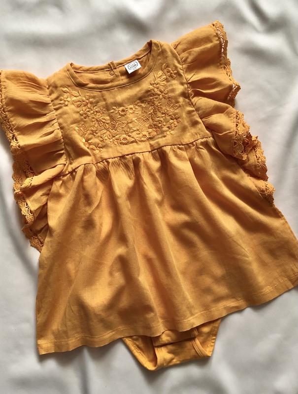 Туніка - боді з тоненької бавовняної тканини з мереживом та вишивкою, в новому стані, без паперових бірочок. Довжина загальна 49 см, Довжина туніки 43 см, Ног. 26 см.