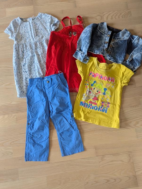 Дитячі речі на зріст 92-98, на штанах є пляма. Ок комплекту входить блакитне плаття, червоний сарафан, джинсова курточка, жовта футболка та блакитні штани.