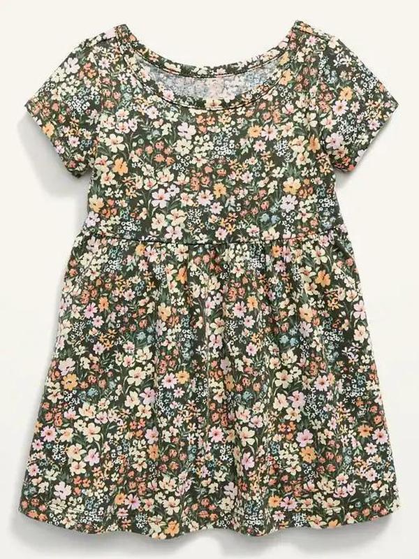 Удобное летнее платье из мягкого хлопкового трикотажа с короткой и расклешенной юбкой. Цвет хаки с цветочным принтом. 100% бавовна.