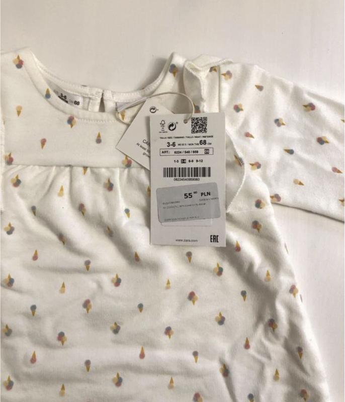 Плаття ZARA Nemo Склад: 96% бавовна, 4% еластен. Колір: екрі, принт ріжок з морозивом. Розмір: 68 см. / 3-6 м. Стан: новий. ( з бірками і пакетиком )