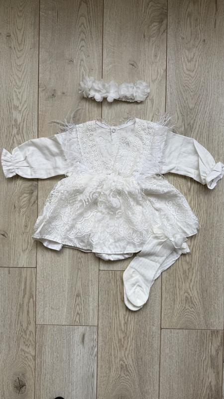 Сукня надзвичайно гарно виглядає, дуже зручно що внизу защіпається, стан ідеальний, одягали один раз на фотосесію, повʼязочка та гетрики також в комплекті
