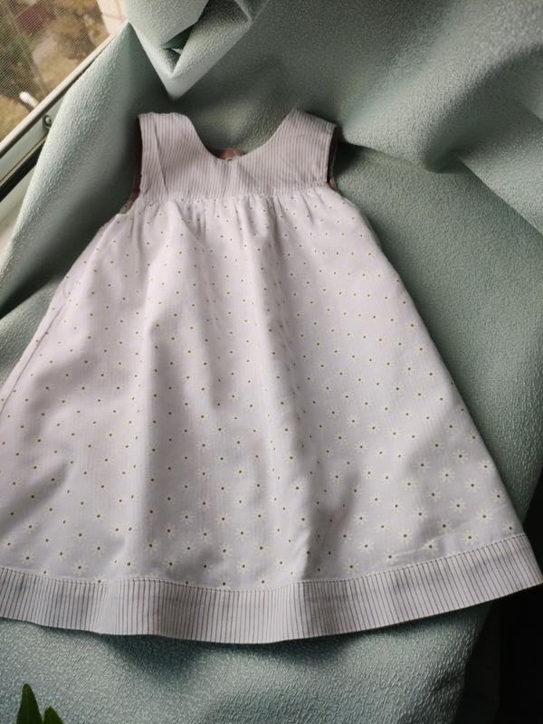 Двустороннее платье-сарафан от Chicco одна сторона – белая в цветы, вторая – в бежевую полоску закрывается на пуговицы по спинке 100% бавовна длина 45см