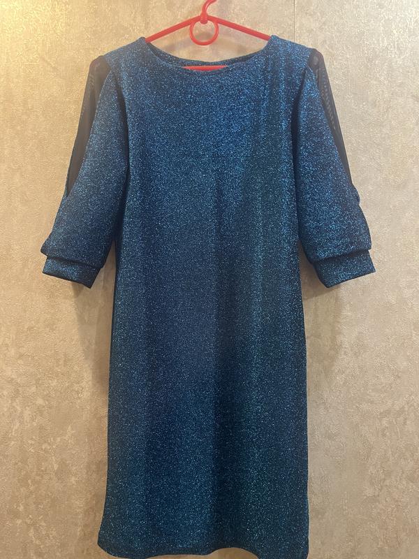 Гарна синя сукня з люрексу, блискітки не сиплються. Дуже гарні рукава зі вставками. Фото не передає насиченості кольору! В живу дуже гарно виглядає. Розмір S-M