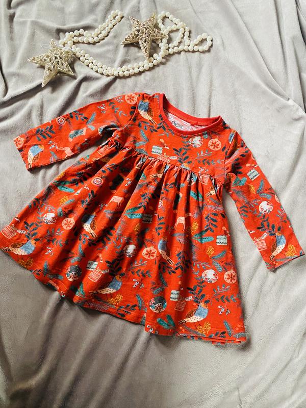 Дуже красиве новорічне котонове платтячко Next. Стан ідеальний. Розмір 86 (12-18 міс), але найкраще орієнтуватись на заміри. Довжина по спинці 44 см. ПОГ 26 см. Довжина рукава 29 см. Дод. фото та заміри на вимогу.