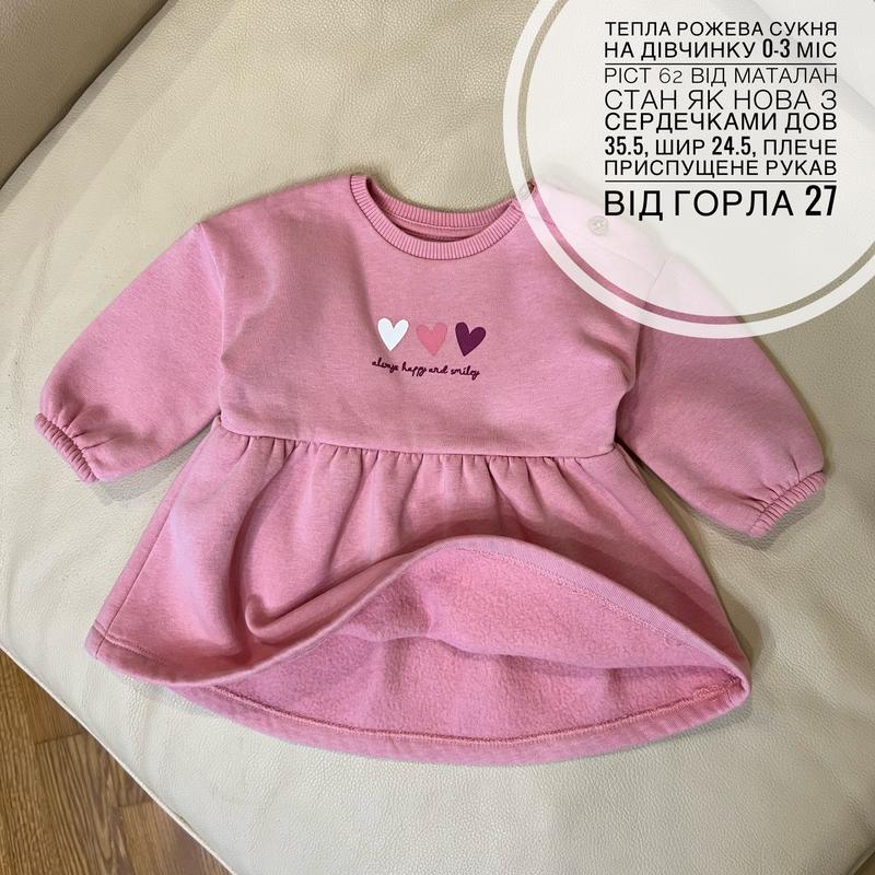 Тепла рожева сукня на дівчинку 0-3 міс ріст 62 від Маталан стан як нова з сердечками дов 35.5, шир 24.5, плече приспущене рукав від горла 27