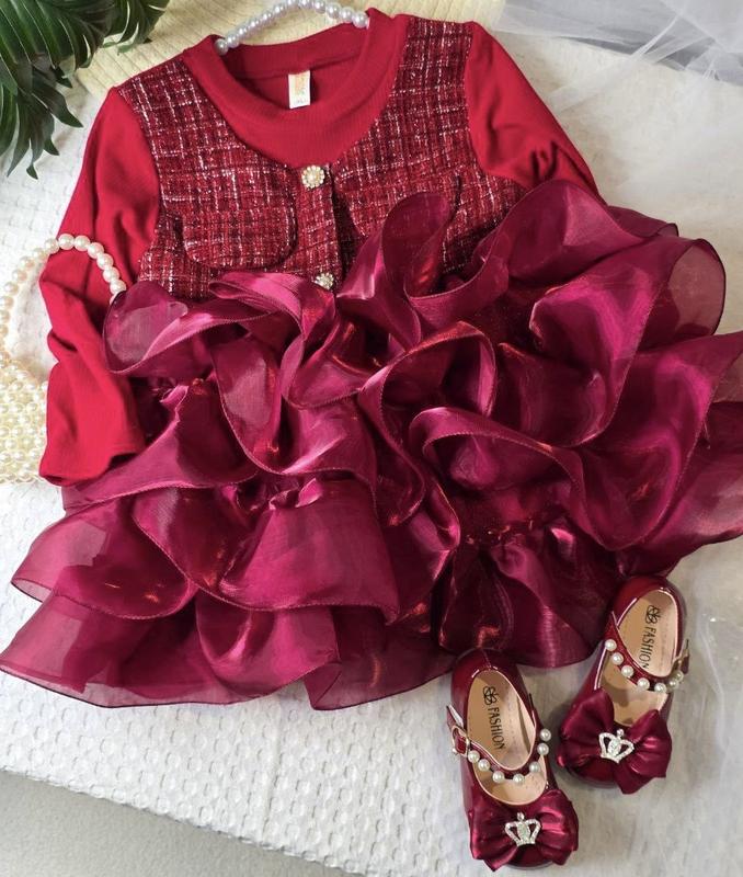 Трикотажний м'якенький верх, жилет-твідовий пришит, юбка - бавовняний підклад і об'ємні шифонові валани. Неймовірна краса ЗАМІРИ 80(M) - довжина 42 ширина 26 рукав 28 90(L) - довжина 44 ширина 28 рукав 30 95(XL) - довжина 46 ширина 29 рукав 32 100(2XL) - довжина 49 ширина 31 рукав 36