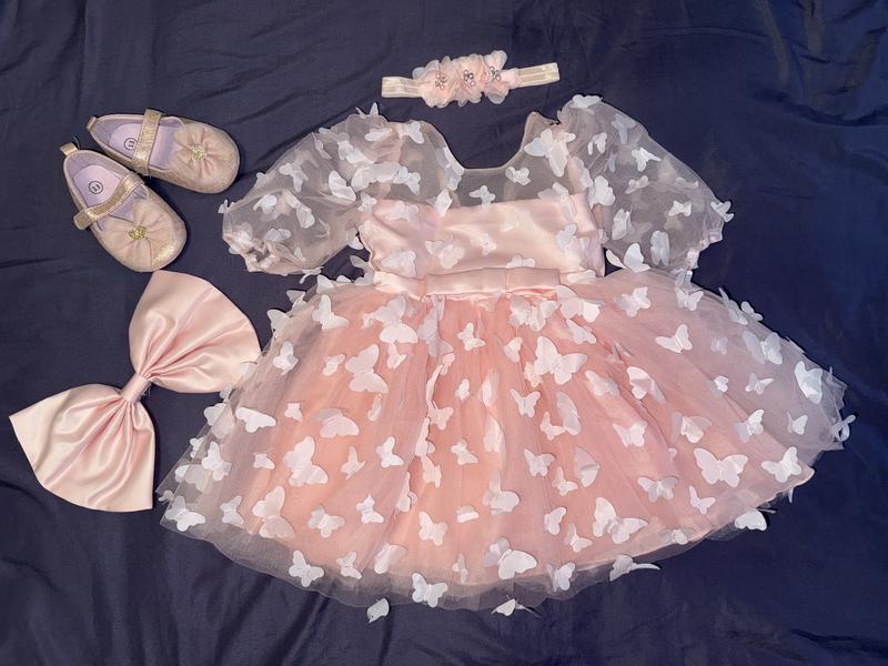 Святкові сукні. В усіх стан нових,одягали один раз для фото! Рожева з метеликами та повʼязкою,великий бант кріпиться на застібки ззаду,розмір 12 міс.(пінетки 13 розмір в подарунок) 400грн Рожева боді-сукня з повʼязкою,на талії резиночка, розмір 62. 350грн Біла боді-сукня з повʼязкою,розмір 0-3міс. 350грн Біло рожева сукня з повʼязкою,розмір 9-12міс. 200гр