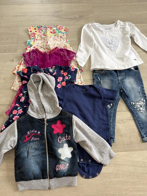 Набір речей для дівчинки,який складається з: Сукня в кольорові трикутники (6-9міс) Сукня в квіточки (6-9міс) Сукня кольору фуксія (6-12міс) Сукня синя в квіточки(12міс) Кофта біла (92см) Джинси(12-18міс) Кофта на застібці (86см) Боді синій (12міс) Колготки Calzedonia у подарунок