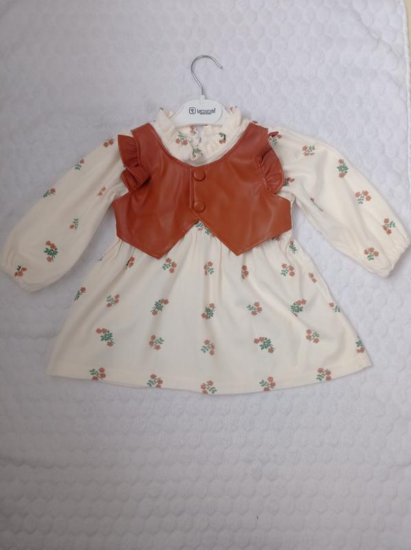 Необычайно милое и нежное платье из микровельвета с цветочным принтом и с добавлением аксессуара в виде жилетки из экокожи. Стан идеален, одевали максимум 3 раза. Размер 6-9 месяцев, полномерный, будет и на дольше. Мы одевали в 1 год.