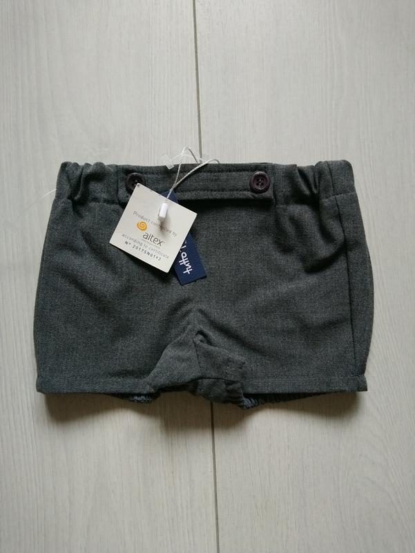 Шорті нові На вік 3 місяців і ріст до 62 см Пояс стягується резинкою на гудзичках Матеріал 64 % поліестр, 32 віскоза і 4 еластан Довжина 15 см Півобсяг пояса 18 см і тягнеться і стягується