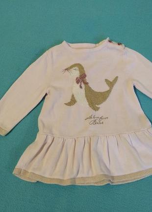 Ошатна трикотажна кофтинка ніжно рожевого кольору з милим золотистим морським котиком від британського преміум бренду Ted Baker на 3-6 міс. Застібається на лівому плечику на два золотисті гудзички. На рукавчиках і по низу оборки золотиста кайомка. Довжина 35 см, Напівобхват під ручками 25 см Довжина рукава від плеча 23 см. Вцілому стан відмінний, трохи є мікрокатишки.