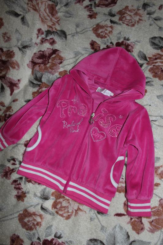 Спортивная кофта в хорошем состоянии, пятен и дыр нет, замок рабочий, есть немного катышек. Примерно на 1-2 года Замеры: Длинна рукава - 30 см Ширина в плечах - 30 см Ширина между подмышками - 32 см Длинна кофты - 34 см
