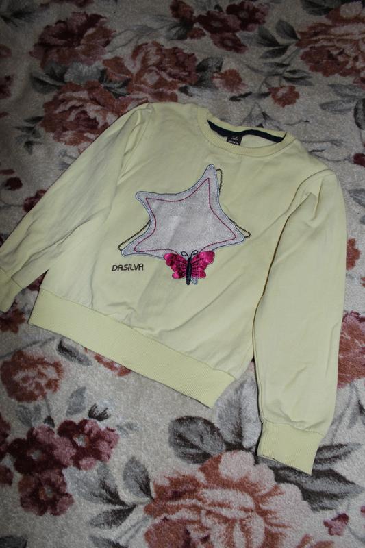Желтая кофта со звездочкой, внутри небольшой начес. Есть маленькое пятнышко возле правого рукава, почти не заметное, выводить не пробовала По бирке: 1-2 года (мы носили до 2,5) Замеры: Длинна рукава - 34 см Ширина в плечах - 26 см Ширина между подмышками - 28 см Длинна - 35 см