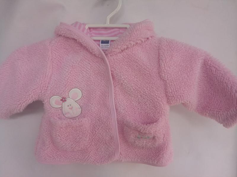 Двухсторонняя теплая кофточка, трикотаж с одной стороны, плюш или махра с другой. По груди 27,плечи 22,рукав20,длина27.М капюшоном, мягенькая и красивая. Размер 3-6месяцев.