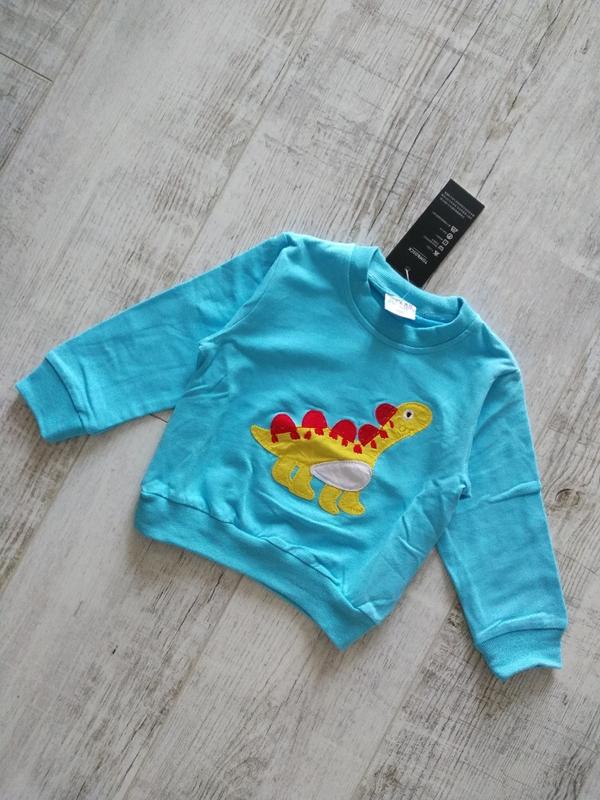 Трикотажный свитшот с нашивкой динозаврика на кофточке. Размеры в наличии 100, 110, маломерят, ориентируйтесь на замеры р.100 - длина кофты 33см, рукав 29 см р.110 - длина кофты 36,5 см, рукав 32 см