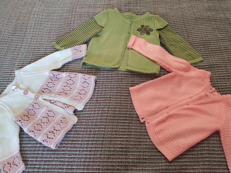 Кофточки белая с фиолетовым 3-6 месяца, персиковая 6-9 месяца, зелёная 9-12 месяца. 35 грн.каждая.