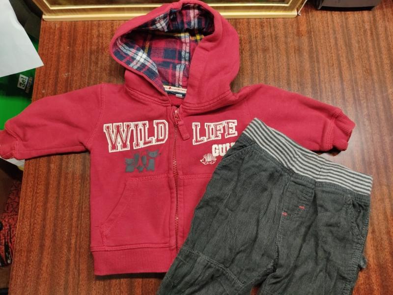 Кофта на замочки для маленького стиляги с карманами и нашивками на локтях. С двойным капюшоном внутри байка. На рост 62. Штанишки 74см. на резинке с карманами длина 34 см.