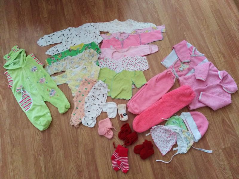 В пакет входят два махровых костюма, комбинезон, распашонки и ползунки, шапочки, носочки и вязаные пинеточки)