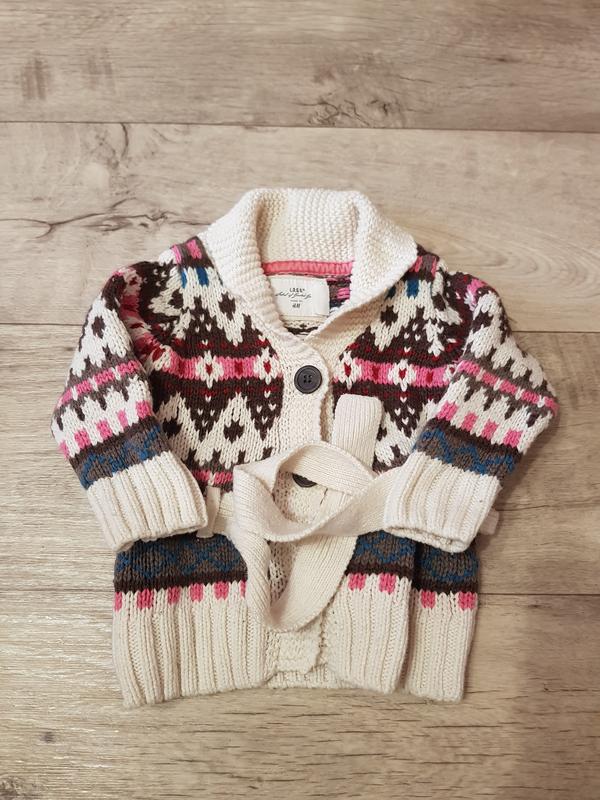 в отличном состоянии кардиган указан размер 6-9 месяцев, но большемерит будет явно на дольше состав: 57% хлопок, 30% полиамид, 13% шерсть