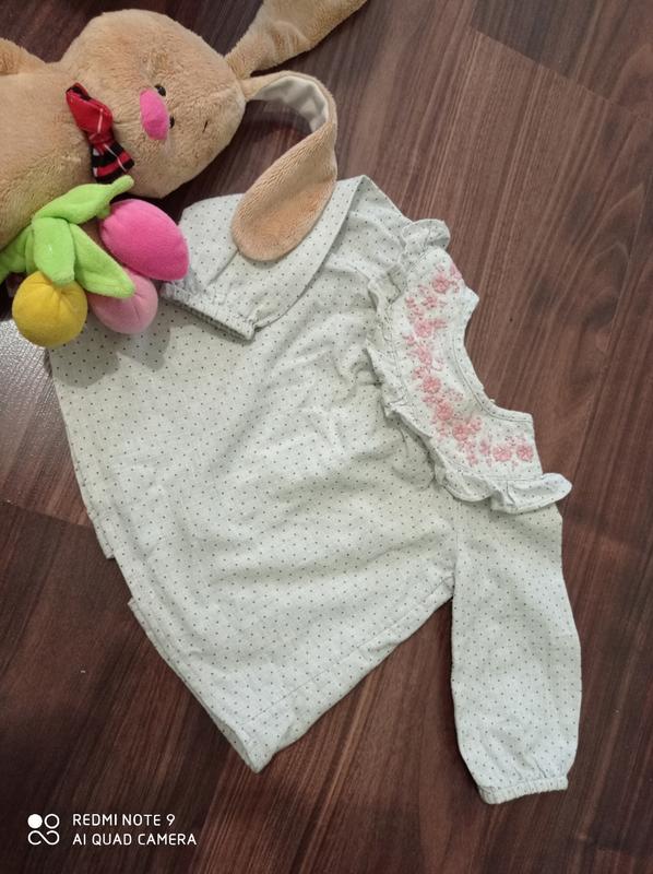 Красивая блузочка с вышивкой, стильная, мягкая. Бренд TU. В отличном состоянии, без пятен, дыр, затертостей. Одета пару раз. По бирке на 3-6 месяцев, на рост 62-68 см. Ориентируйтесь на замеры. Длина 30,5см, ширина груди 28 см, длина рукава от ворота 28 см. Фасон немного расклешенный к низу.