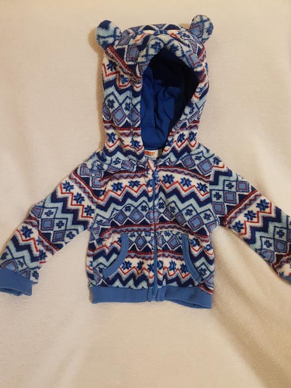 Кофта из нежного мягкого плюша (велюра). Покупалась в Канаде. Замок работает, как новый. Мне нравилось, что благодаря специальной нашивке, бегунок замка не соприкасается с детским горлышком, а как-бы прячется в карманчик. На фото 3 пыталась показать. Фирму не знаю...