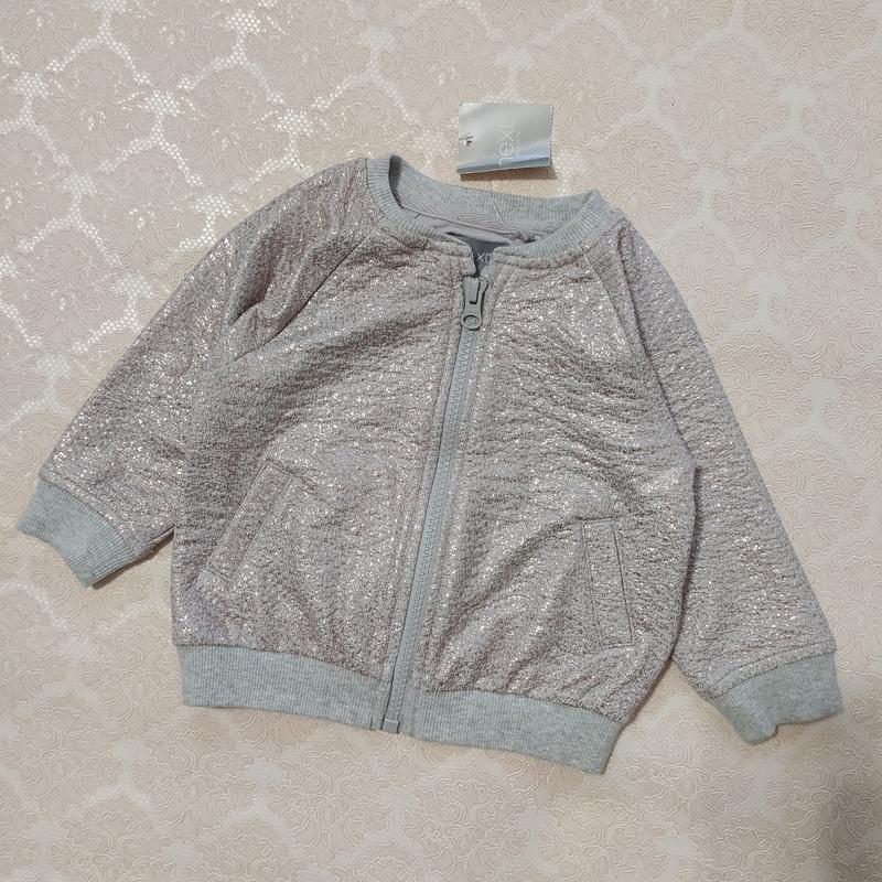 Новая с биркой кофточка фирмы Next по бирке 6/9 мес.,но будет на 9/12 мес.замеры:длина 31 см,рукав от горловины 31 см.В живую очень красиво блестит камера не передает.Цена 280 грн.