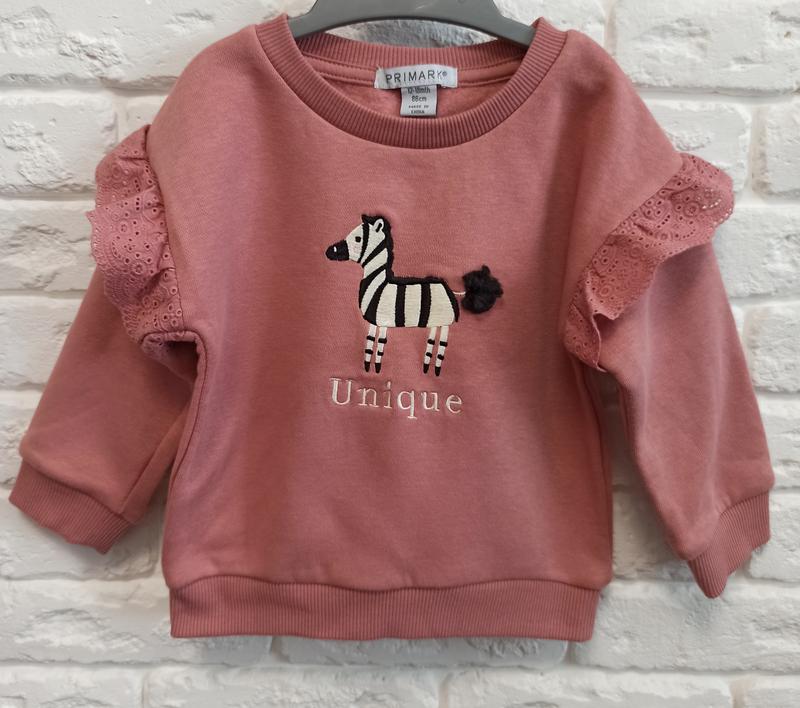 Свитшот на девочку Primark утепленный. Размеры : 74: длина 30см, ширина 27см, длина рукава от горловины 30см(в этом размере сзади застежка на 2 кнопки) 80: длина 33см, ширина 28см, длина рукава от горловины 33см. Состав ткани: 60%коттон, 40% полиэстер. Страна-производитель: Китай