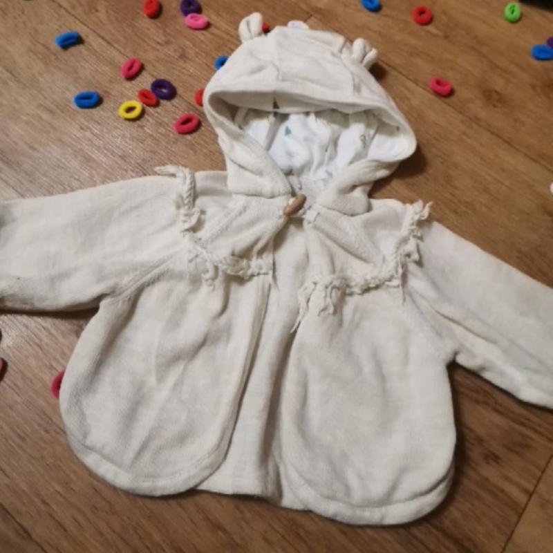 Очень крутая вещичка для модника, кофта с капюшоном с ушками, написано от 3 месяцев, дочь носила и как накидка в 9 месяцев. Одна деревянная пуговица, капюшон с подкладкой.