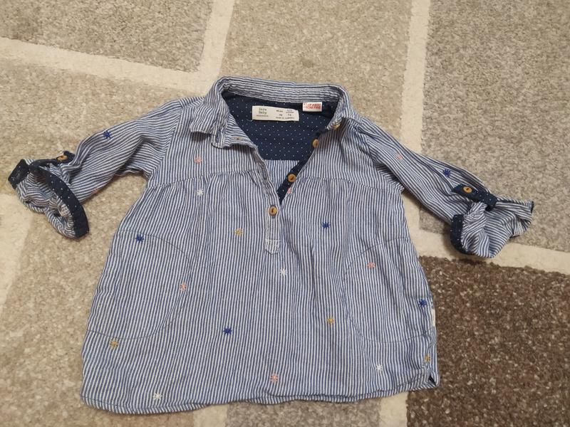 Стильна рубашка на дівчинку, рекомендований ріст 74 см. Рукавчика підкочується та застібається. Заміри: плечі 22 см ширина під ручками 29 см довжина рукавчика від плеча 24 см довжина по спинці 33 см.