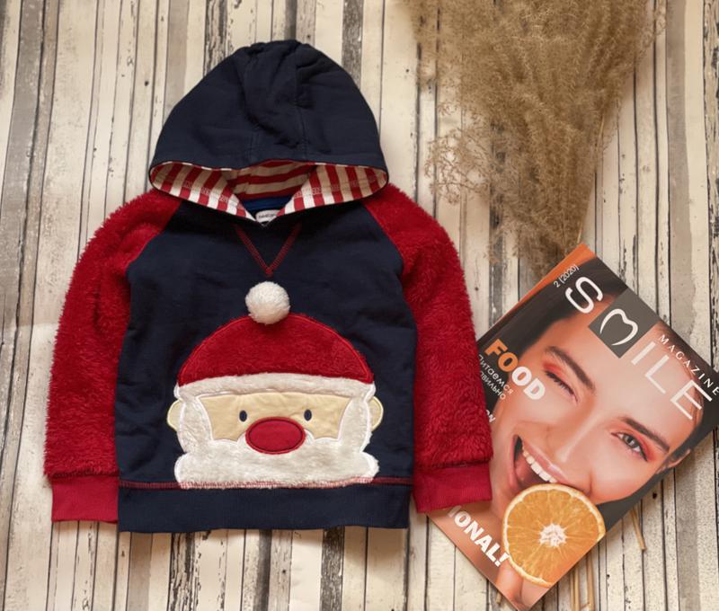Теплая новогодняя кофта капюшонка по бирке на 2-3 года, МАЛОМЕРИТ будет на 1,5- 2 года, смотрите замеры спереди принт деда мороза, внутри с начесиком, рукава теплый флис В отличнейшем состоянии замеры: длина 34 см ширина под руками 32 см рукав от капюшона 37 см