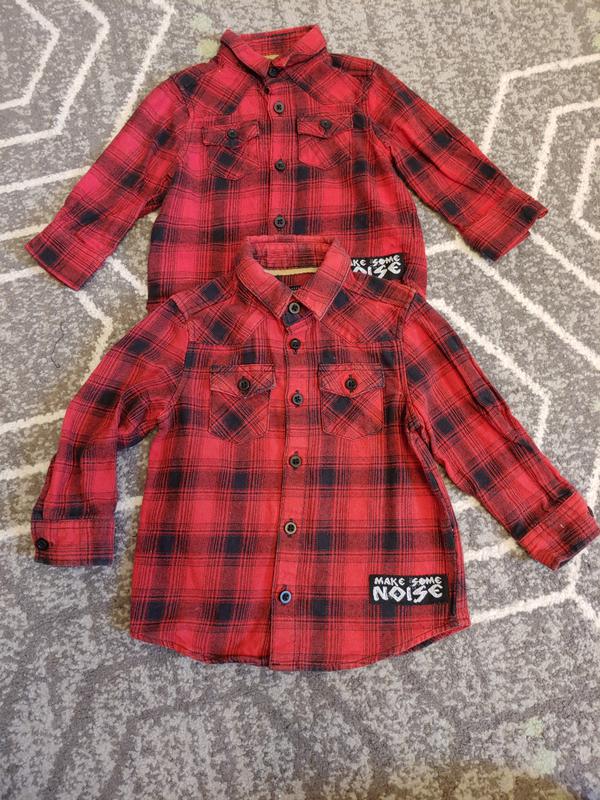 Две рубашечки Family look для малышей 6 -9 мес. и 12-18 мес. (смотрите по замерам). В хорошем состоянии. Большую носили чаще, поэтому цвет не такой яркий. Замеры 6-9 мес.: - длина 35 см, плечи 22 см, рукав 25 см. Замеры 12-18 мес.: - длина 30 см, плечи 20 см, рукав 23 см. Хлопок 100%. Цена за одну рубашку.
