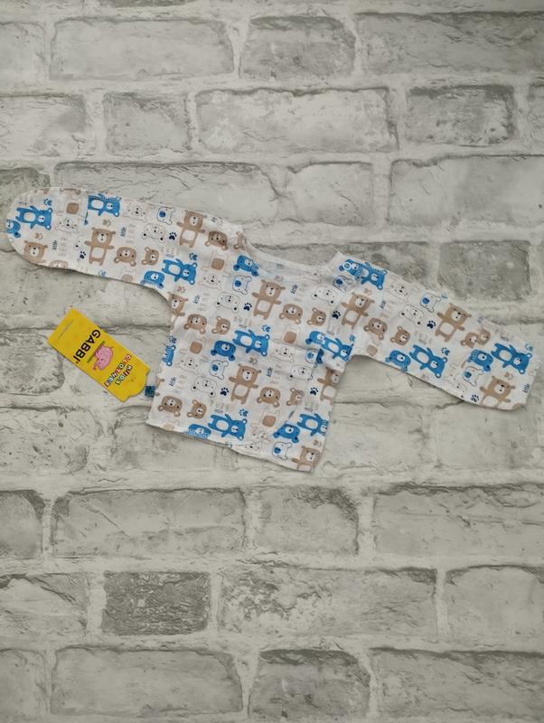 Распашонка "Рукавица" для мальчиков на кнопочках. Размер 62 (3-6 месяцев). Перчатки (царапки) отворачиваются, что позволяет пальчикам быть открытыми. Материал: 100% хлопок. Очень приятная и легкая на ощупь.