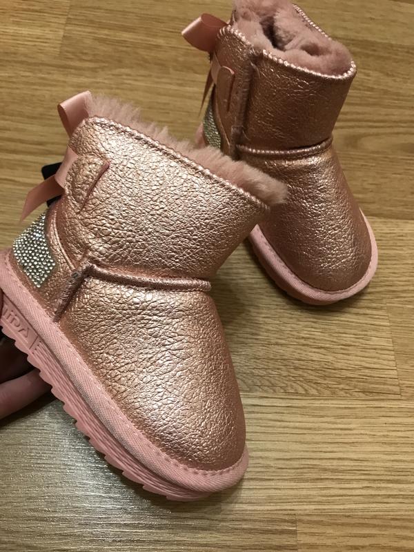 Теплі та стильні уггі для маленьких модниць . Уггі виконані з екошкіри утеплені хутром.легенькі, м’які . Ззаду пяточка оздоблена, дуже гарно виглядають на ніжці. Устілка без супінатора( не виймається). Колір рожевий перламутр. Розмір 20-13 см; 21-14 см; ціна знижена через те що можуть бути сліди примірки.