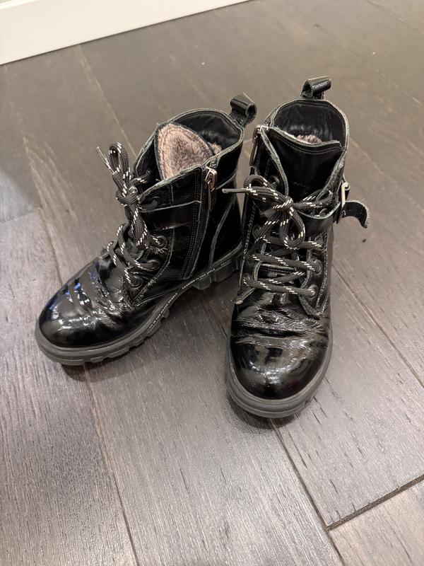 Зимові лаковані стильні чоботи для дівчинки 29 розмір, повномірні, на хутрі, застібка - блискавка, шнурівкою можна регулювати на різну товщину та підйом ніжки