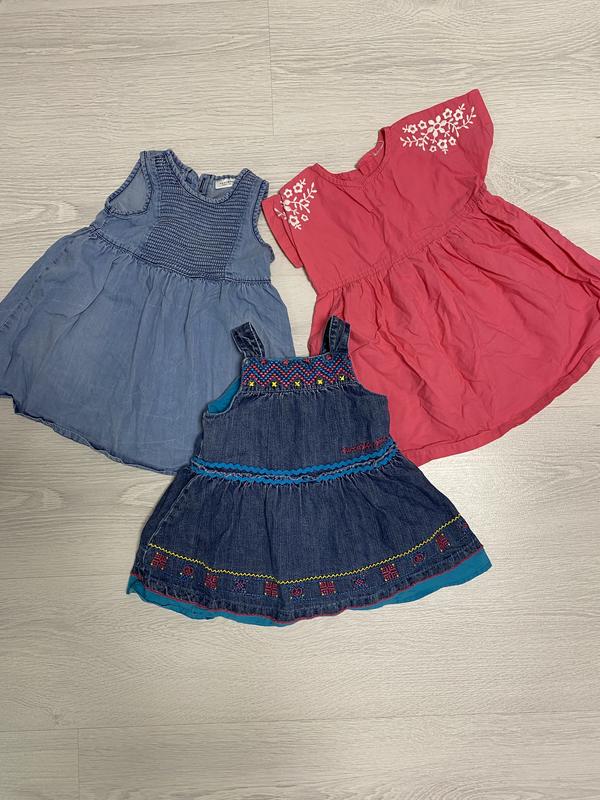 Лот из 3-х вещей: Розовый хлопковый сарафан, легкий и просторный Джинсовый легкий сарафан Плотный двухслойный джинсовый сарафан, для более прохладной погоды Размер по набору 6-9 месяцев, но будет дольше Рост около 68-75 см