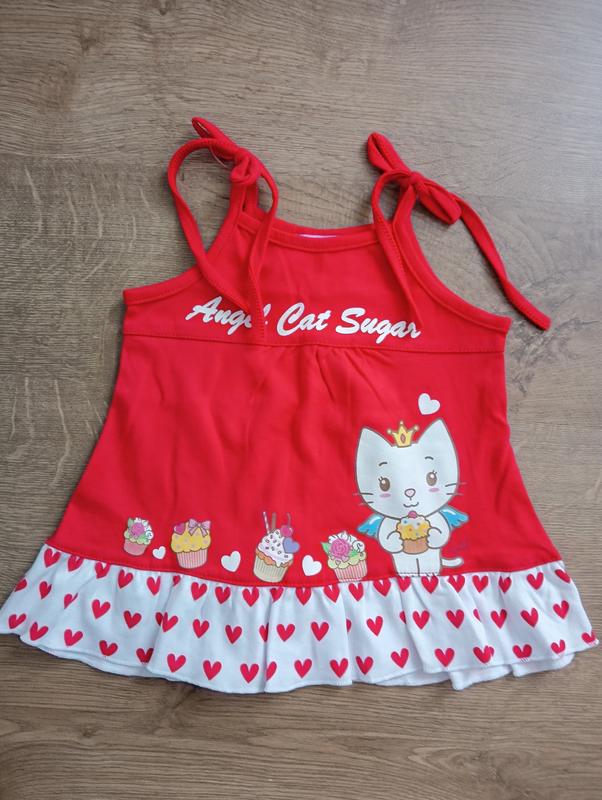 Новенький сарафанчик. Размер 3-6 месяцев. Длина 32см., в груди 27,3см., в плечах 12,5см., длина завязок 31,5см. Ткань 100% хлопок.