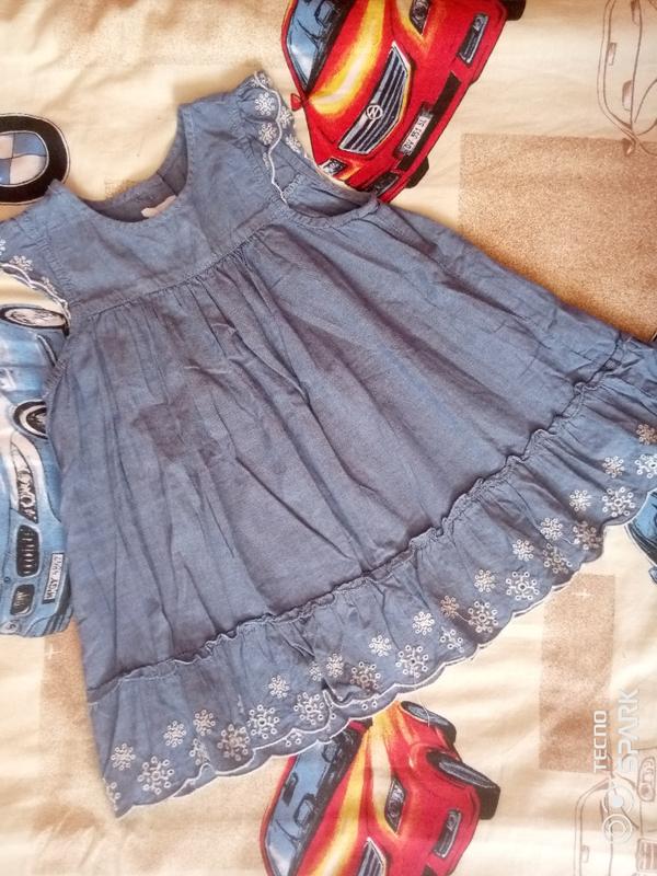 джинсовый сарафан, платье фирменный, легкий низ украшен нежной вышивкой Состояние хорошее 9-12 месяцев