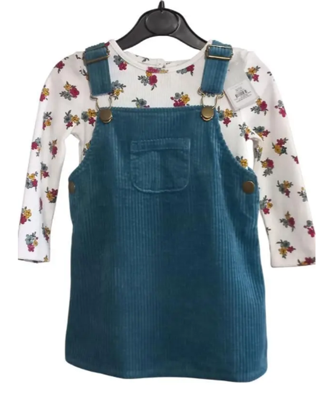 Набір складається з вельветового сарафану, квіткового реглану в рубчик та колгот в тон. Реглан позаду застібається на один гудзик. Сарафан має кнопочки по боках, накладну кишеньку попереду та регулюючі шлейки. Красивого кольору морської хвилі. Колготи в тон реглану, молочного кольору, носочки в кольорі сарафану. Набір в дійсності дуже красивий та стильний. Розмір в наявності: - 86р. на 1-1,5 рочки, але з урахуванням регулюючих шлейок, сарафан буде значно на довше. Іспанія