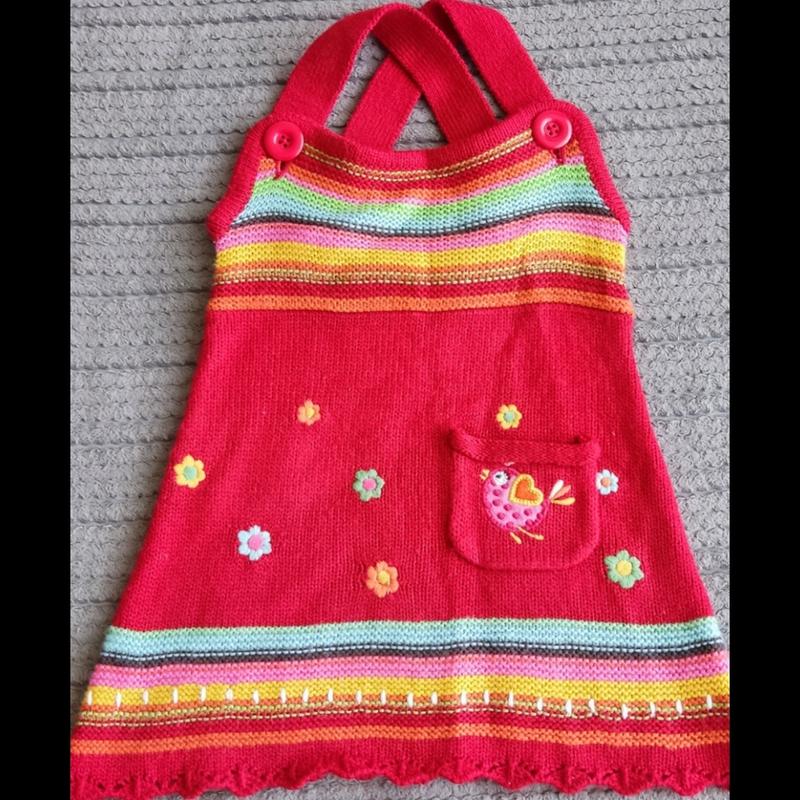 Дитячий в'язаний тепленький сарафан яскравого кольору.