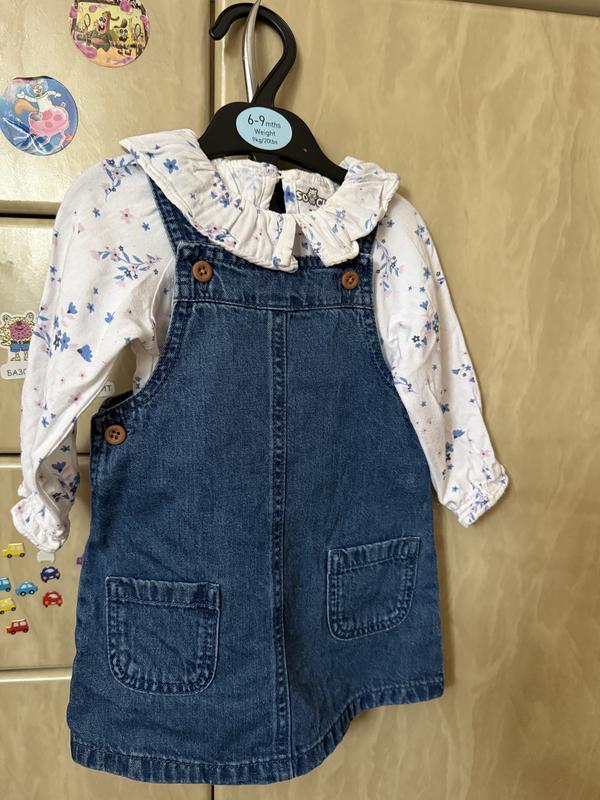 Неймовірно красивий набір: джинсовий сарафан та боді в ідеальному стані. Розмір 6-9 місяців. Довжина сарафана 35 см. Максимальна довжина 44 см. Ширина 25 см.