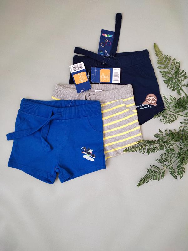 Набор шортиков на мальчика немецкой фирмы lupilu. До набору входять 3 шт. Размер указан на наборе 2-6 мес. 62-68 см. полуобхват пояса 23, пояс на резинке с завязками. Общая длина сбоку 19 см. Ткань приятная к телу, 100% хлопок. Сзади есть имитация карманчиков.