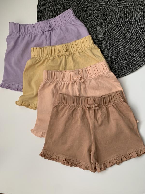 Шортики🤎 Стан: -5/5 всі в хорошому стані, розовенькі на останньому фото є дефекти, в носці зовсім не помітні) Розмір: 6-9 м Заміри: талія 18 см Довжина 20 см Бедра 27 см