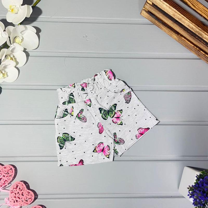 Шорты с любимым принтом бабочками. Склад тканини: 95% бавовна, 5% еластан Замеры: (маломерят) 1 год (86) - дл 19,5